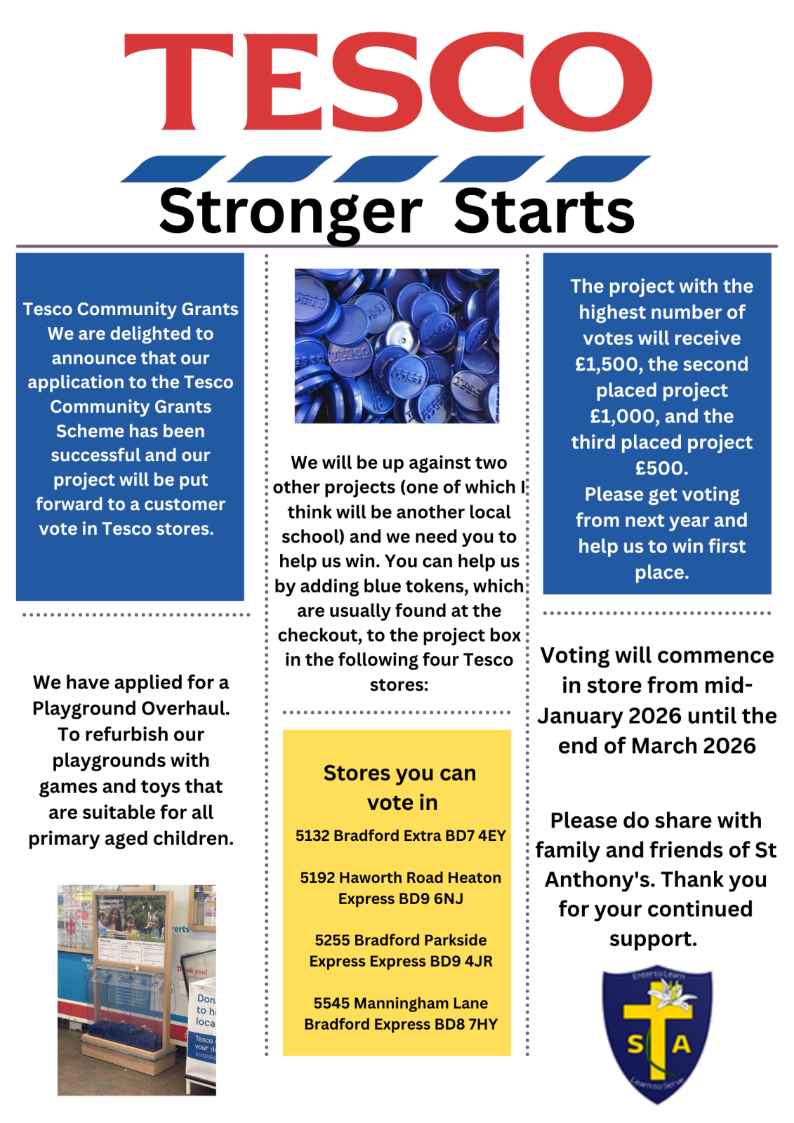 Tesco grant - please put tokens in the stores named in the poster.